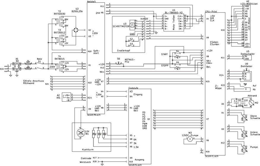Der Schrittmotor U3 und die beiden Endschalter S2 und S3 befinden sich im Erodierkopf. Der Schrittmotortreiber U4 wird mit 24VDC