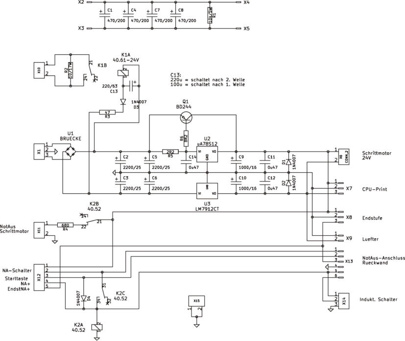 Die Notaus-Schaltung ist auf der Netzteilplatine untergebracht. Das habe ich wegen der besseren Übersicht getrennt gezeichnet: