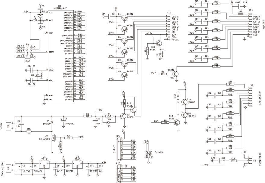 Der Controller soll die Maschine unabhängig vom PC steuern. Die Schaltung ist mit einen ATMEGA auf einer Eropakarte aufgebaut.