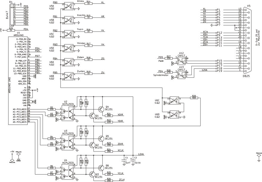Die Signale von den Endschaltern der Maschine gelangen über die Koppler U5 und U6 = ILD2 (ILD1 ist nicht geeignet) zum Arduino. Wenn