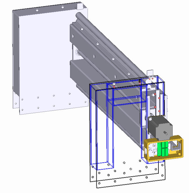 Die X-Achse wird links und rechts mit den Wangen des Portals verschraubt. Diese Wangen bestehen aus je 3 Quadratrohren aus Aluminium (44, 44, 42). Darauf sind beidseitig 3mm-Alubleche (72...75) flächig verklebt. Weil die Quadratrohre nur 2mm Wandstärke haben, sind dort wo Gewinde nötig sind, innen Alustangen mit einen Querschnitt von 10x10mm eingeklebt.