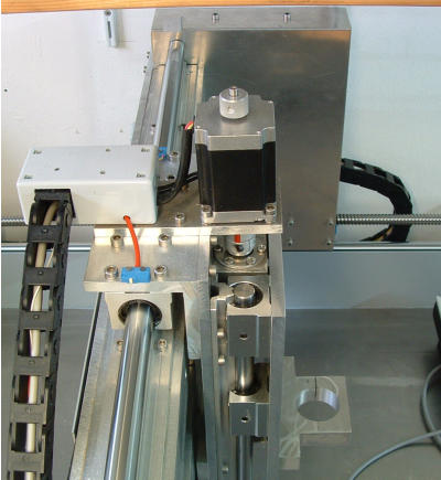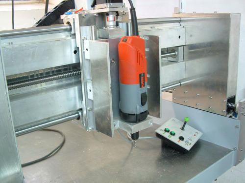 Die Montageplatte (35) für die FräsSpindel wurde nachträglich mit Blechen (53) beiden Seiten versteift. Mit dieser Maßnahme wurde ein verbiegen der Montageplatte bei Belastung mit 100N von 0,08mm auf 0,03mm verringert.