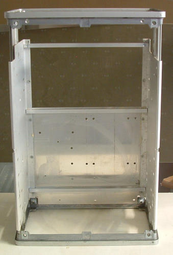 Das Foto zeigt das leere Gehäuse. Es hat links und rechts senkrechte Bleche,