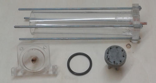 Ein Plexi-Rohr, da=40, di=32, Länge = 170mm, ist mit den unteren Deckel verklebt. 4 Gewindestangen M4 sind am unteren Deckel