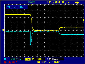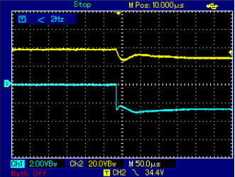 Nach etwa 50us reagiert die Stromregelung und regelt auf den Minimalwert