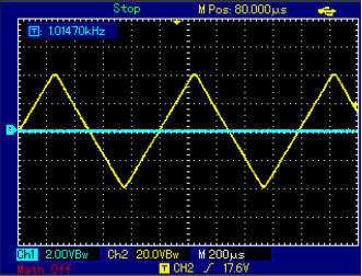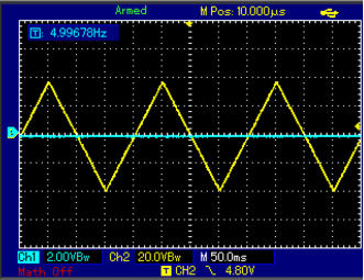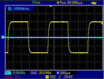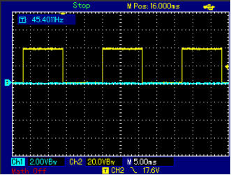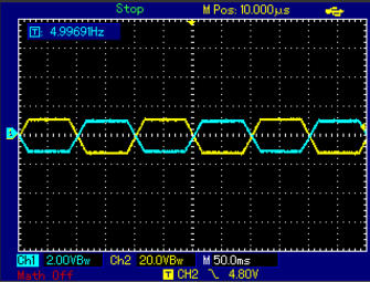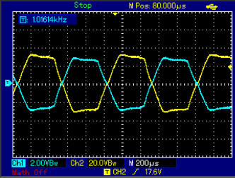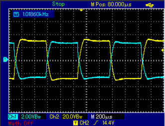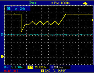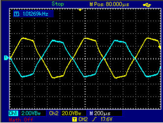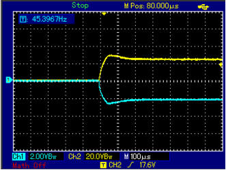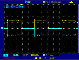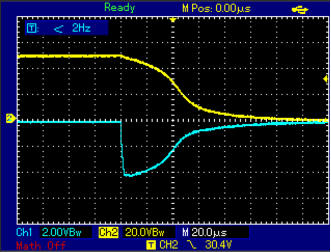 Die blaue Kurve zeigt den Strom (invertiert) und die gelbe die Spannung.