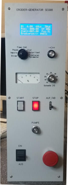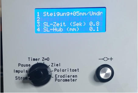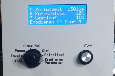 Ohne Bedeutung, nur für Entwicklung Erodierstrom von 1,5A bis 10,5A Impulsdauer 2us bis 99us Impulspause 2us bis Impusdauer    Ist-Position EP = Erodierpause (”Timer”) 0 (=Aus) bis 99 Sekunden  Ziel, muss negativ sein  Polarität, 4 Betriebsarten: 	1.	Positiv 	2.	Positiv mit SL (Sackloch-Modus) 	3.	Negativ 	4.	Negativ mit SL (Sackloch-Modus) Hinweistexte, Fehlermeldungen oder wenn der Schalter auf “Erodieren Parameter” steht die Auswahl wie hier sichtbar  Ändern der Daten: mit Datenwahlschalter wählen, wird im LCD mit Pfeil gekennzeichnet, und dann die Daten mit den Drehknopf verändern. Kann in 1er, 10er (schnell drehen), 100er (Knopf gedrückt) und 1000er (Knopf gedrückt und schnell drehen) -Schritte erfolgen.  Die Ist-Position kann nur auf 0 gesetzt werden:  drücken + drehen. Im STOP kann natürlich die Ist-Position mit den Hebel “-<>+” verändert werden. Die Auf/Ab-Geschwindigkeit wird mit den Hebel nicht linear verändert sondern in 10 Stufen. Die unterste Stufe bewegt in 0,01mm-Schritte.   In der Stellung 8 (Rechtsanschlag: “Erodieren Parameter”) des Datenwahlschalters kann man zwischen Erodieren und Konfigurieren (”Config”) mit den Drehknopf umschalten.   In diesen Config-Modus kann man einstellen: •	Stellung 7: Anteil des Leerlaufs •	Stellung 6: Anteil der Kurzschüsse •	Stellung 5: Zykluszeit, die Nachstellzeit für den Schrittmotor.  Diese 3 Werte bestimmen die Stabilität und Qualität der Erodierung.   Dreht man den Schalter weiter erscheint das nächste Bild.  •	Stellung 4: SL-Hub von 0.1mm bis 9,9mm •	Stellung 3: SL-Zeit von 0.1 bis 9.9 Sekunden  Der SL (Sackloch)-Modus bewirkt ein permanentes Stampfen/Anheben des Werkzeugs in der angegeben Zeit um die angegebene Höhe. Damit wird der Abbrand heraus gepumpt.  •	Stellung 2: Leer •	Stellung 1: Steigung der der Z-Spindel, um wie viel mm sich das Werkzeug bei 1 Umdrehung des Z-Motors bewegt.    Wie funktioniert die Regelung des Funkenspaltes?  Die wichtigste Aufgabe der Firmware ist die richtige Nachführung der Z-Achse beim Erodieren.  Die Zeiten der beiden Zustände Kurzschluss (Erodierspannung unter Schwellwert) und Leerlauf (Erodierspannung = Maximum) werden von der CPU mit einer Auflösung von 0,38us erfasst. Wenn die Kurzschlüsse über z.B. 10% der Zykluszeit auftreten, wird der Schrittmotor mit einen einzigen Takt die Z-Achse anheben. Wenn die Leerläufe über z.B. 41% sind, wird um einen Takt nach unten bewegt. Wenn keines davon auftritt, das ist der gewünschte Zustand, bleibt der Schrittmotor stehen. Der Anteil dieses Sollzustandes wird mit dem Messwerk in Prozent der Zykluszeit angezeigt.  Der Schwellwert zur Kurzschluss-Erkennung wird mit das Poti “Schwelle (V)” gewählt. Die Wirkung kann sofort am Messwerk kontrolliert werden.  Der Schwellwert zur Leerlauf-Erkennung ist fest eingestellt. Bei meiner Version 2 hatte ich noch ein Poti vorgesehen. Das hatte aber keine erkennbare Wirkung und wird jetzt durch eine Brücke ersetzt. Welche 3 Werte (Zykluszeit, Kurzschluss, Leerlauf) die besten Ergebnisse liefern, kann man nur durch Testreihen ermitteln.