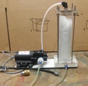 Zum Erodieren wird ein Behälter mit Erodier-Dielektrikum benötigt. Werkzeug und Werkstück müssen sich im Dielektrikum befinden. Der beim Erodieren entstehende Abbrand erfordert einen Dielektrikum-Umlauf mit Filter. Ein Ansaugnapf ist unten im Behälter. Von dort geht ein Schlauch ans untere Ende des Filters. Das Filter besteht aus ein mit Filterwolle gefülltes senkrechtes Plexi-Rohr. Die Pumpe saugt am oberen Ende des Filters und pumpt das Dielektrikum über einen Schlauch mit Schwanenhals in den Behälter zurück. Zum Testen habe ich als Dielektrikum destiliertes Wasser verwendet. Ist zum Erodieren nicht ideal. Weil das Wasser trotz Destillation elektrisch schwach leitend ist. Das Werkzeug mit dem Werkstück ist im Wasser ein galvanisches Element. Dadurch zersetzten sich beide wenn sie nicht aus dem Wasser heraus geholt werden. Richtiges Erodier-Elektrikum ist leider nicht in kleinen Mengen lieferbar, weshalb ich mich zunächst mit Wasser zufrieden geben muss. Als Filterwolle habe ich zerfleddertes Lautsprecher- Dämmmaterial verwendet. Die Filterwirkung ist gut wie man im Bild unten erkennt. Im unteren Teil ist der schwarze Abbrand und oben ist das Wasser wieder glasklar. Das Plexi-Rohr ist etwa 200mm lang, Durchmesser ist außen 60mm und innen 53mm. Abdichtung erfolgt mit Gummi-Ringe. Die Plexi-Platten oben und unten werden mit vier Gewindestangen M4 zusammen gedrückt. Die selbst ansaugende Pumpe ist ein 12V / 60W Exemplar. Wird für Anwendungen z.B. als Dieselpumpe beworben. Die beiden Schlauchanschlüsse an der Pumpe sind auf der Drehmaschine angefertigt worden und mit 2K-Kleber an der Pumpe untrennbar fixiert. Die Pneumatik-Stecker sind mit Gewinde eingeschraubt.