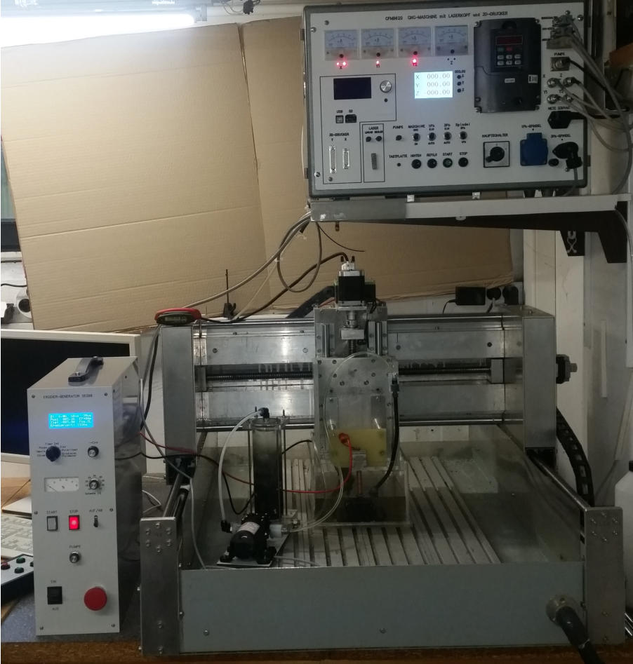 Die “Version 3” besteht aus: 1. Erodier-Generator 2. Pumpeneinheit mit Filter 3. Z-Achse meiner CNC-Portalfräse. Die Elektronik im Erodier-Generator ist mit der “Version 2” bis auf kleine Änderungen identisch. Die CPU-Platine, die Endstufe und der Kühlturm sind unverändert.  Das Netzteil ist wegen der vereinfachten Notaus-Schaltung neu. Die Firmware der CPU ist erweitert worden: 1. Die Steigung der Z-Spindel ist von 1 bis 10mm pro Umdrehung einstellbar. Die Werte für 8mm und 5mm sind getestet worden. 2. Statt der Auf/Ab-Wippe jetzt ein Joystick- Poti. Wird analog eingelesen und in +/- 10 verschiedene Geschwindigkeiten verwandelt. Der Generator wird mit einer 9 poligen Sub-D Leitung mit der Z-Achse der CNC verbunden. Sobald der Generator eingeschaltet ist, schalten Relais am Z-Motor die 4 Leitungen des Motors und die beiden Z-Endschalter von der CNC- Steuerung auf den Generator. Die X- und Y-Steuerung der CNC bleibt in Betrieb. Kann zum Einrichten mit Hilfe der Hand- Bedienung der CNC verwendet werden. Leider kann  man den Kühlmittelumlauf der CNC nicht fürs Erodieren verwenden. Je nach Zustand des Kühlmittels ist das Ergebnis katastrophal. Zum Erodieren wird ein Behälter für die Erodierflüssigkeit benötigt. Die Pumpeneinheit mit Filter ist fürs Erodieren unbedingt nötig. Die Pumpe wird an den Generator angeschlossen. Die Pumpleistung ist stufenlos einstellbar.
