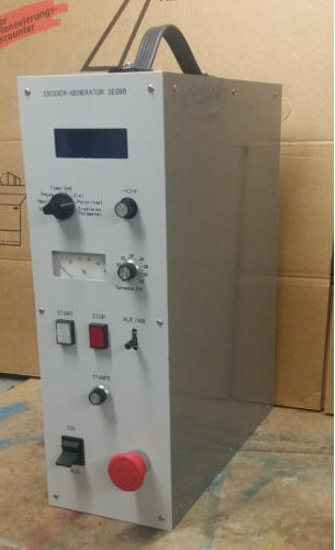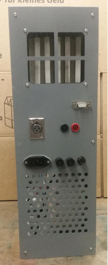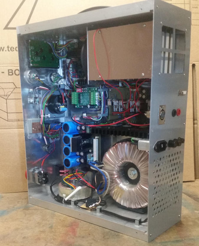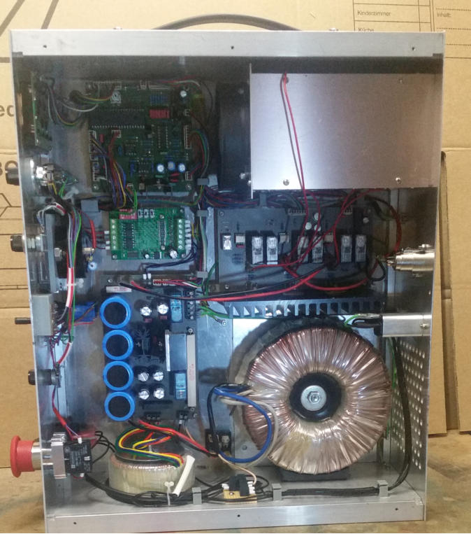 Der Generator sollte ein kompaktes, hochkant stehendes Gehäuse. Wegen Platzmangel in meiner kleinen Werkstatt sollte er nur sehr wenig Grundfläche verbrauchen. Fertige Gehäuse passen nie. Sie sind entweder zu klein, zu groß, oder zu teuer. Also habe ich wieder den Selbstbau vorgezogen. Auf eine 360x440x3mm-Aluplatte sind zwei 360mm lange Alu-Quadratprofile, Querschnitt  140x20mm, oben und unten mit den Konstruktionskleber “RK- 1300” verklebt. Wegen der recht großen Klebefläche von 360x20mm ist die Tragfähigkeit sehr hoch. Der Generator hat wegen des großen Trafos ein Gewicht von 17kg. Zur Versteifung sind vorn und hinten je eine Alu-Quadratstange 8x8x406mm drauf geklebt. In den Profilen sind an allen vier Enden je zwei Alu- Quadratstangen 8x8x70 eingeklebt. Die sind nötig weil dort noch M3-Gewinde fürs Front- und Rückwand-Blech und der Abdeckplatte rein müssen. Der 1,1kVA-Ringkerntrafo für die Erodierspannung bekommt auf der Aluplatte noch ein 4mm-Alublech. Damit die Schraube im Zentrum des Trafos beim fest ziehen die Platte nicht verbiegt. Der 1,1kVA-Trafo ist etwas zu groß, den hatte ich günstig besorgen können. Eigentlich reichen 650VA aus. Die Platinen für die Endstufe und Netzteil wurde mit der Voronoi- Methode auf der CNC gefertigt. Die CPU-Platine habe ich extern anfertigen lassen. Der Kühlturm ist eigentlich eher ein Heizofen. Hier werden die unbedingt nötigen Widerstände fürs Erodieren mit einen Lüfter gekühlt. Die Luft wird von den Löchern in der Rückwand unten angesaugt und durch die Widerstände oben an der Rückwand nach draußen gedrückt. Auf diese Weise werden auch die anderen Wärmequellen gekühlt.