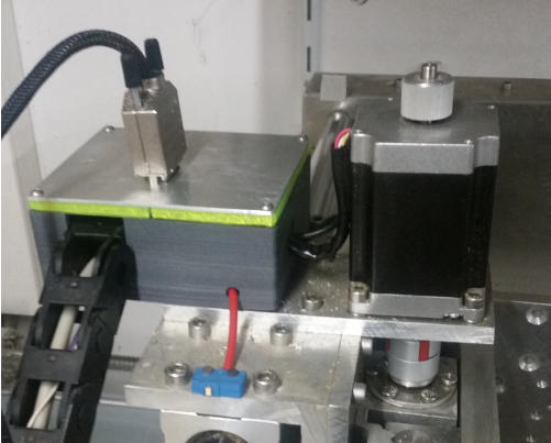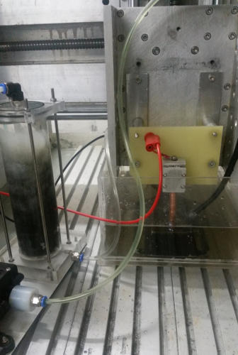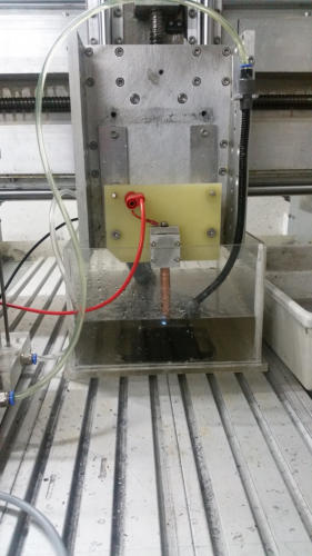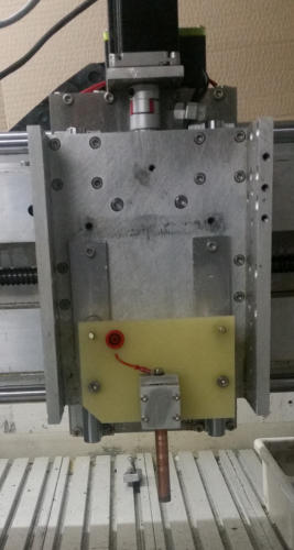 Der Generator wird mit einer 9-poligen Sub-D-Leitung mit der CNC-Portalfräse verbunden. Oben am Z-Motor ist eine Box mit Relais. Sobald der Generator eingeschaltet wird sind die Relais aktiv und der Erodier-Generator übernimmt die Steuerung der Z-Achse. Die X- und Y-Motoren der CNC werden davon nicht beeinträchtigt. Das Erodier-Werkzeug kann in Y und X-Richtung mit den CNC-Joystick zum Einrichten verfahren werden. Die CNC hat eine Positionsanzeige wobei natürlich nur die X- und Y- Anzeige funktioniert wenn die CNC und der Erodier- Generator eingeschaltet sind. Eine Platte aus 6mm-Epoxy FR4 dient als Werkzeughalter. Wird mit zwei Schrauben auf die Z-Achse montiert. Die Z-Achse bewegt sich um 5mm bei einer Umdrehung des Motors. Pro Takt bewegt sich dann das Werkzeug um 1,5625u. Das Erodieren funktioniert mit dieser Z-Achse sehr stabil und ruhig.