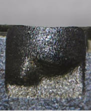 Das Rundkupfer wurde am oberen Rand des Stahlwinkels herunter erodiert. Die Fotos zeigen die Kante von der Seite. Im Laufe des Tests