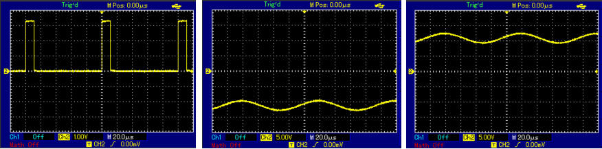Links: einer Steuerspannung 0 bis 3,2v, PWM = 11%. Mitte: Sinus von -9,5V bis -12,6V. Rechts: Sinus von +9,2V bis +12,2V