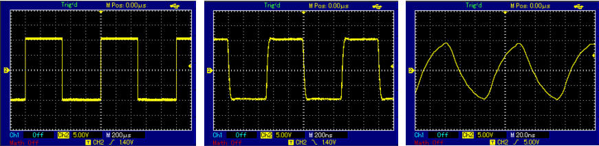 Beispiele für Rechtecksignale: links = 1kHz, Mitte = 1MHz, Rechts = 10MHz