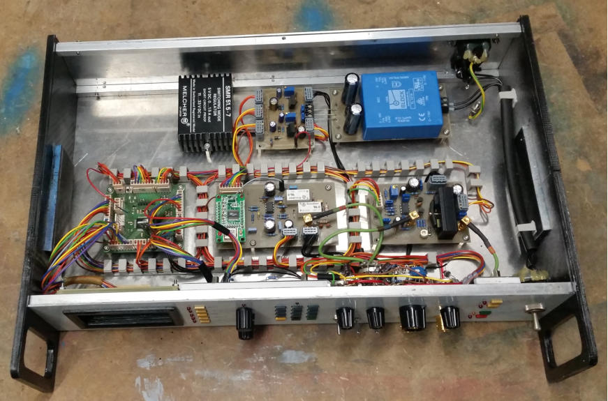 Dann kommt das “AMPL”-Poti für die Einstellung der Ausgangsspannung. Dahinter kommt eine Endstufe. Die hebt das Signal auf maximal