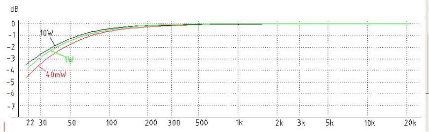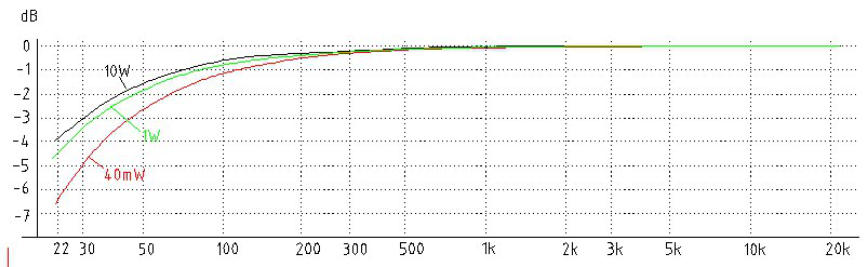 Tatsächlich ändert sich der Frequenzgang je nach Ausgangsleistung. Mit (1) habe ich folgende Frequenzgänge bei unterschiedlichen