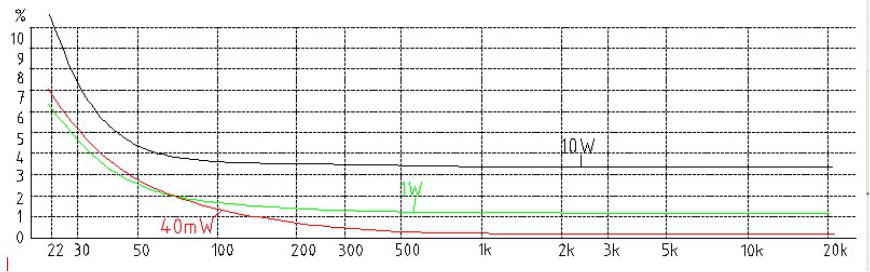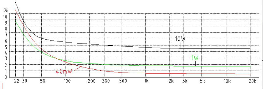 Das Verhältnis des Klirr bei 1kHz und 22Hz ändert sich je nach Aussteuerung. Bei geringer Ausgangsleistung ist es am größten. Das