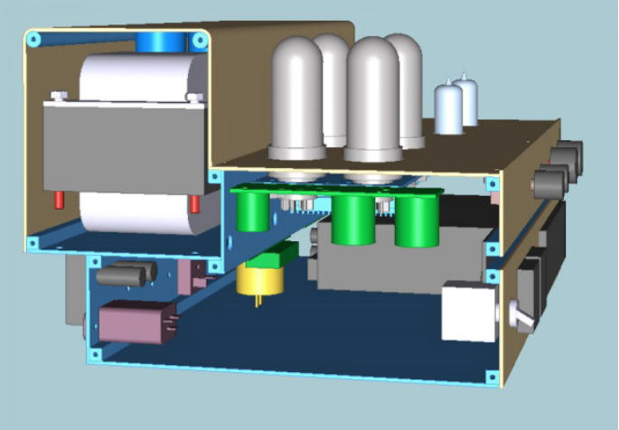 3.) Die Siebelkos für die Vorstufen und die Trimmer für die Gitterspannung sind auf eine getrennte Platine auf der rechten Seite neben den