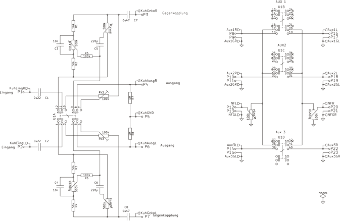 U1b ist der Eingangsverstärker. Das Signal kommt vom Lautstärkepoti. Zwischen U1B und U1A sind die Bauteile für den Kuhschwanz-