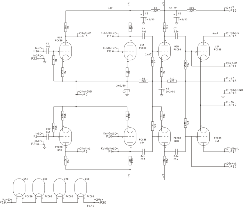 Entzerrer auf der Tasten-Platine. Die Röhre U2 ist der Treiber für die VMOS-Schaltung. U2A ist galvanisch mit den VMOS verbunden. Die