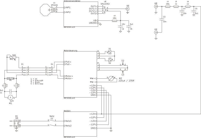Über eine 4-polige Leitung von X4 nach X1 wird der Stellmotor angeschlossen. L2, L7 und C1 entstören den DC-Motor. Das ist ein kleiner