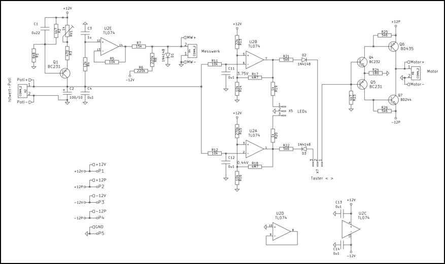 RV1 ist ein mit der Motorwelle gekoppeltes Sollwert-Poti. Die Stromaufnahme des Motors beträgt im Stillstand (= Anlauf) 120mA, im Betrieb