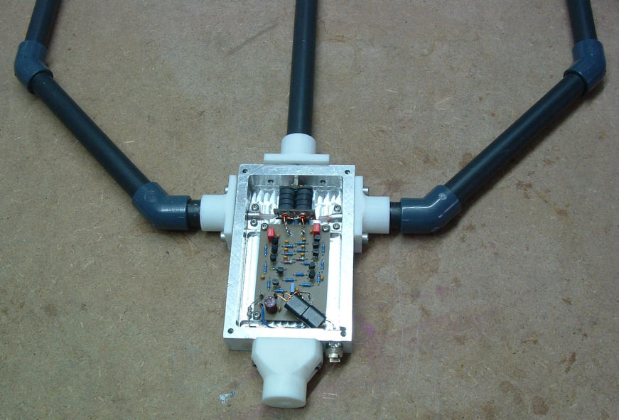 Platine verlötet, deren Kupferschicht in der Mitte aufgetrennt ist. Das ist der Eingang, also der Antenneneingang. Die Anregung zu dieser