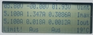 0.000 korrigiert. Regler 1 ist voll belastet und in die Strombegrenzung, Text “Limit!”