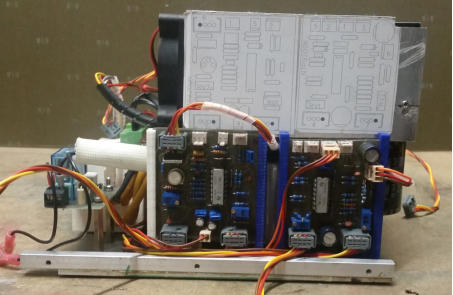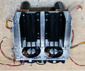 Die Regler-Platinen sind senkrecht in kleinen Führungen links