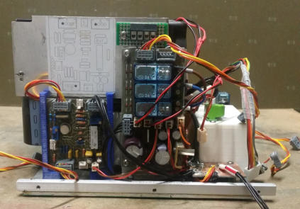 Hauptteil, rechte Seite mit -15V/3A- Regler und +15V/0,3A-Regler Linke Seite mit +30V/5A-Regler und Relaisgruppe mit +/-12V-Versorgung
