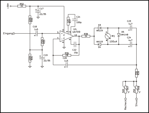 Der Schaltplan oben zeigt den Sinusgenerator und den Sinus/Rechteck-Wandler. Die Umschaltung Sinus <> Rechteck erfolgt mit der Taste U3.