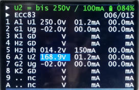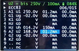 Die Auflösung der Anzeige beträgt beim Strom aus U1, U2 und Ug 0,1mA. Beim Heizstrom aus Uh ist die Auflösung etwa +/-2mA.