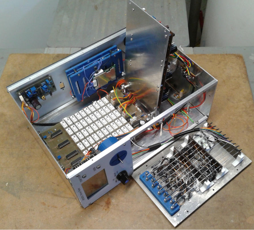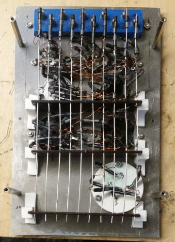 ein Relaisfeld mit 10x5= 50 Relais nötig. Die 10 Pins sind mit 4mm-Buchsen und mit 7 Röhrenfassungen verbunden.