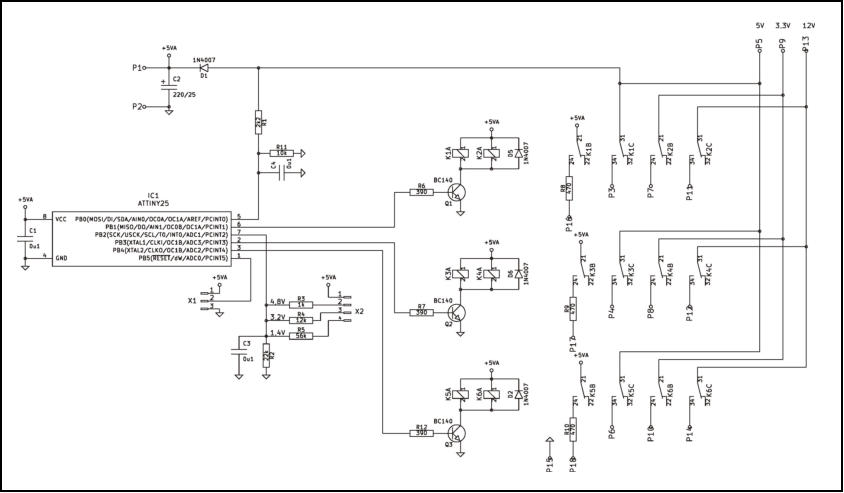 Über Pin 5 erkennt der ATTINY ob der PC aktiv ist. Die 3 Tasten zum Ein/Aus-schalten sind am X2 angeschlossen und werden an Pin7