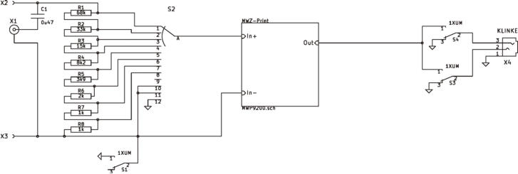 Abschwächer mit einen Drehschalter X2. Der teilt die Eingangsspannung in acht 6dB-Schritte herunter (-6dB = halbe Spannung). Mit den