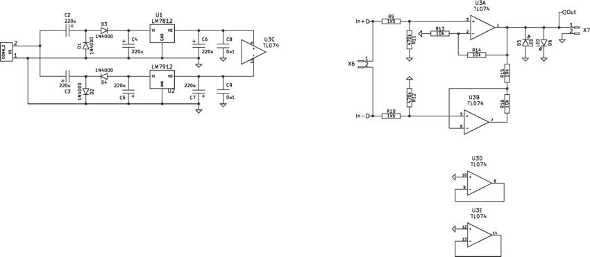 geht direkt vom TL074 ohne Widerstand zum Ausgang. Um eine niederohmige Ausgabe zu erreichen. Die beiden LEDs D5 und D6