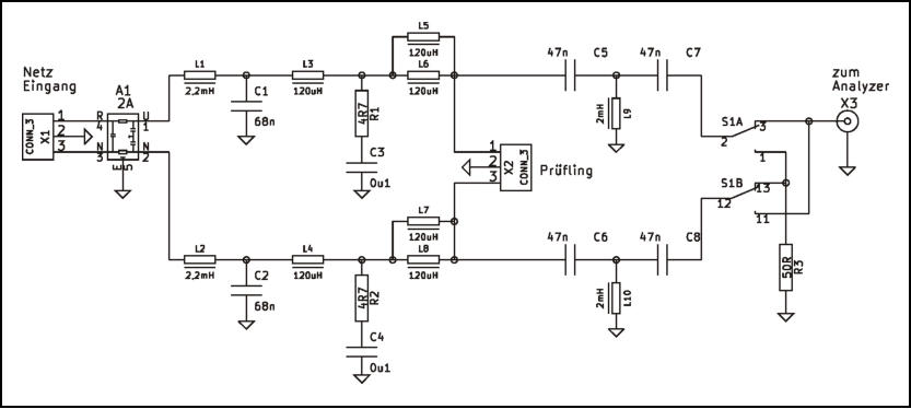 X2 ist der Anschluss für einen Prüfling (Schukosteckdose). Die Impedanz des Netzes wird mit L5, L6, R1, C3, L3 und C1 gebildet. Die