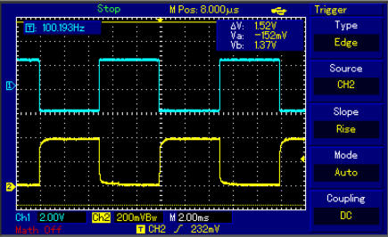 Der Spannungssprung von 10V auf 50V (gelbe Kurve) löst den Trigger am Oszilloskop aus.