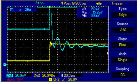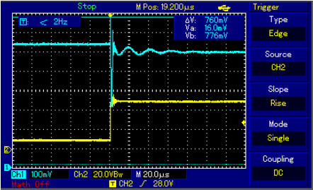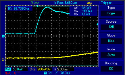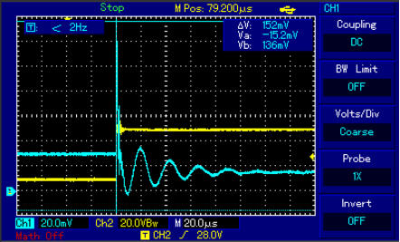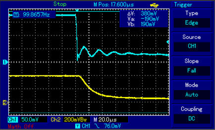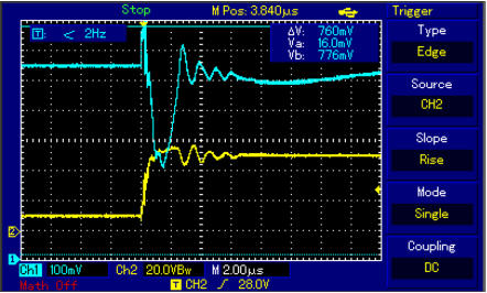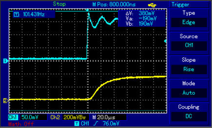 Etwas beunruhigend ist noch ein Effekt, der beim plötzlichen Spannungssprung auftritt. Dann entsteht ein kurzer Stromimpuls durch den