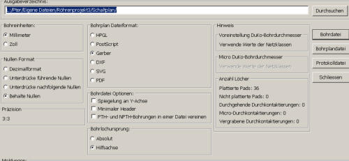 Bohrdatei erzeugen: Millimeter, Behalte Nullen, Gerber, Hilfsachse