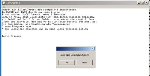 Dies Programm will in der Originalstückliste von KiCAD als Trennzeichen statt Komma ein Semikolon haben. Das muß man in KiCAD beim