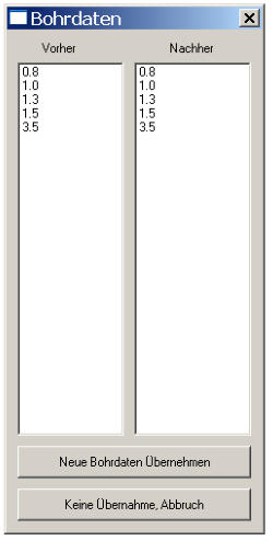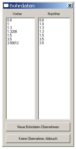 danach erscheint das obige Fenster “Bohrdaten” mit den vorhandenen und daneben die gekürzten Bohrdaten. Nach “Neue Bohrdaten
