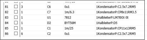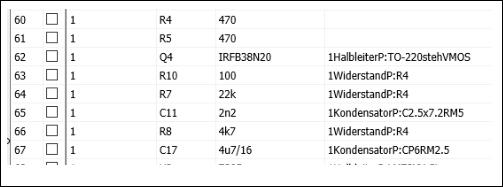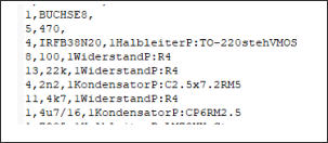 Die Stückzahl gleicher Bauteile wird addiert und die Liste dann mit Komma als Trennzeichen ausgegeben.