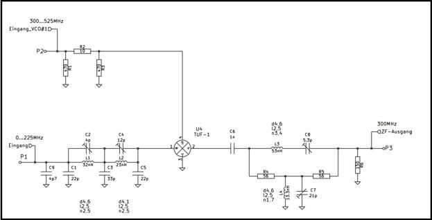 Übersprechen der beiden 300MHz-Oszillatoren in den jeweils anderen Zweig verhindern. Über den Spannungsteiler R3/R6 wird die HF