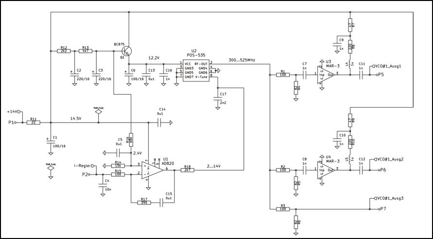 Der VCO POS-535 liefert 300MHz bis 524,400MHz. Die Frequenz wird durch die Spannung am Pin 8 bestimmt. Der OP AD820 wandelt die