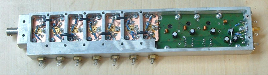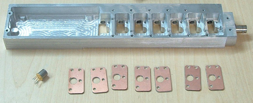 Die HF-Baugruppen sind in 6 kleinen Gehäusen eingebaut. Diese Gehäuse bestehen aus 2 Alu-Halbschalen, oben eine Aluplatte und unten