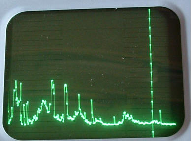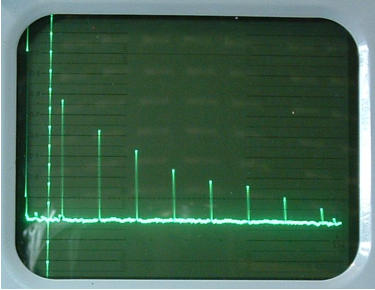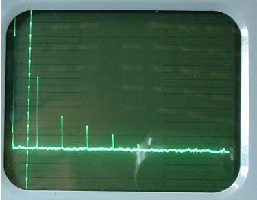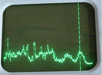 Der Cursor wurde zur Seite geschoben, damit die erste Nadel sichtbar ist. Links am Bilschirmrand ist die Nullstelle (= 0 Hz) sichtbar.
