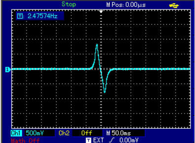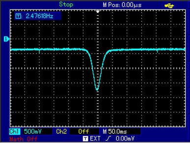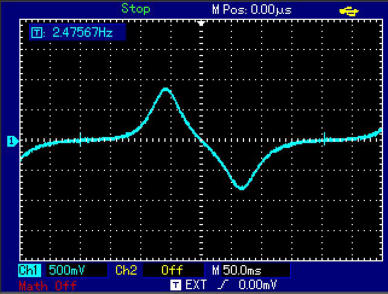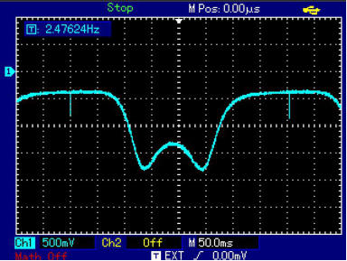 Zunächst wurde hier der Hub auf 16kHz eingestellt. Ein kompletter Hub dauert 400ms. Wenn die X-Skala auf 50ms/cm eingestellt ist,