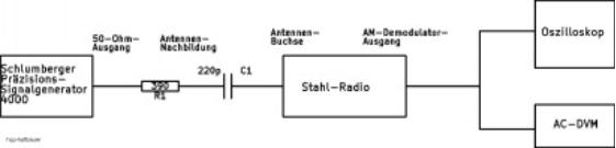 wurde mit einer Antennen-Nachbildung ans Stahl-Radio angeschlossen. Damit ist auch der Vorkreis abgeglichen worden. Gemessen wird mit 30% AM