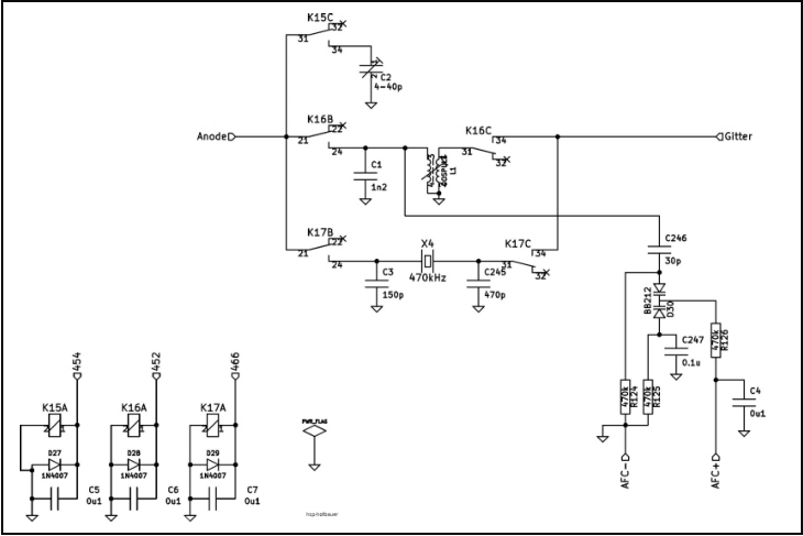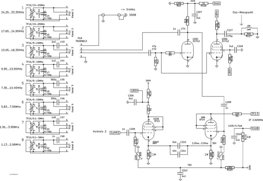 Der Oszillator arbeitet mit der Triode der Röhre U20=ECF12 in Meißner-Schaltung. Die Betriebsspannung an "Uosz" kommt (räumlich) von der Frontgruppe. Hier ist für jeden Frequenzbereich ein getrennter Trimmer vorgesehen. Damit wird die Oszillatorspannung für alle Bereiche eingestellt. Umschaltung erfolgt mit den Stufenschalter am Rastwerk für den Trommelwähler. Die Pentode ist ein Trennverstärker. Damit soll eine Frquenzänderung vermieden werden wenn ein Frequenzzähler angeschlossen wird. Inzwischen wird hier das Oszillatorsignal für den integrierten Frquenzzähler abgegriffen, siehe Seite 9 (Update).Die Röhren U19=EF14 und U8=EF14 bildet den Mischer. Diese Schaltung entspricht etwa einen "Pullen-Mixer". Die EF14 ist die einzige Röhre im Stahl-Radio mit getrennt herausgeführter Kathode. Der Stahlkolben liegt auf GND. Mit den Trimmern RV9 und RV10 ist die Mischstufe auf besten Rausch/Signal-Abstand eingestellt. Die Wirkung ist zwar nicht umwerfend gut aber etwas bewirkt es. Die Mischstufe wird nicht geregelt.